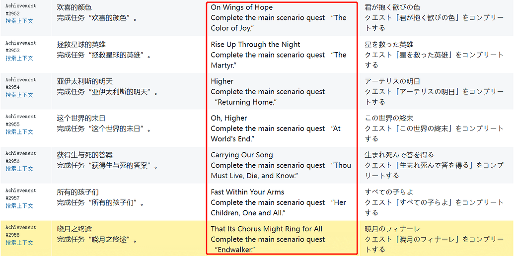 在完成每版本的最后一个任务时,会获得一个成就。中文和日文版的成就均以当前版本命名,本次 6.0 也不例外;英文版则翻译的更加灵活。